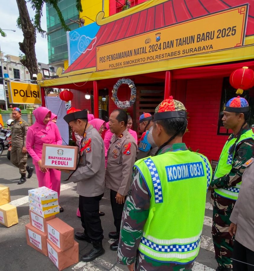 SURABAYA – Suasana berbeda terlihat di Pos Pengamanan Natal dan Tahun Baru (PosPam Nataru) Polsek Simokerto di Jalan Gembong, Surabaya. Kunjungan dari Bhayangkari Pengurus Cabang Polrestabes Surabaya, yang dipimpin oleh Wakil Ketua Bhayangkari, Nyonya Ayu Wimboko, menjadi momen spesial dalam rangka kegiatan bertajuk “Bhayangkari Peduli.”