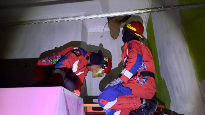 Korban diketahui berada tepatnya di ruang tengah atas plafon dan dalam keadaan tidak bergerak menggunakan kaos lengan panjang warna abu-abu dan celana pendek warna coklat crem.