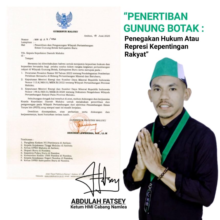 NAMLEA- Ketua Himpunan Mahasiswa Islam (HMI) Cabang Namlea Abdula Fatcey mengkritisi surat Gubernur Maluku tanggal 19 Juni 2025, yang meminta Kepolisian Daerah Maluku melakukan penertiban dan pengosongan aktivitas Penambangan Emas Tanpa Izin (PETI) di Gunung Botak.