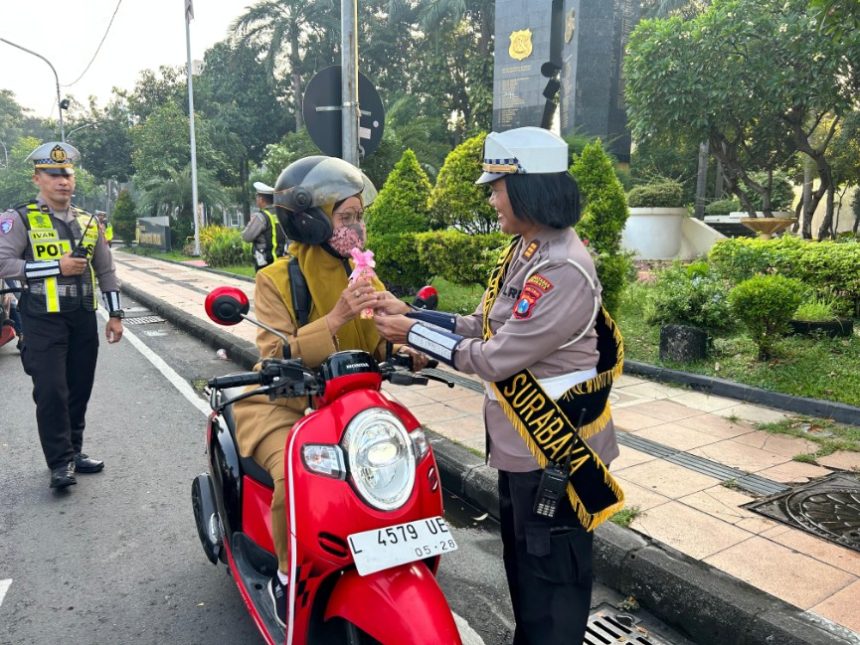 SURABAYA- Dalam rangka peringatan hari Kartini, Polwan Satlantas Polrestabes Surabaya mengapresiasi perempuan perempuan hebat di Surabaya yang tetap tertib dalam berkendara.