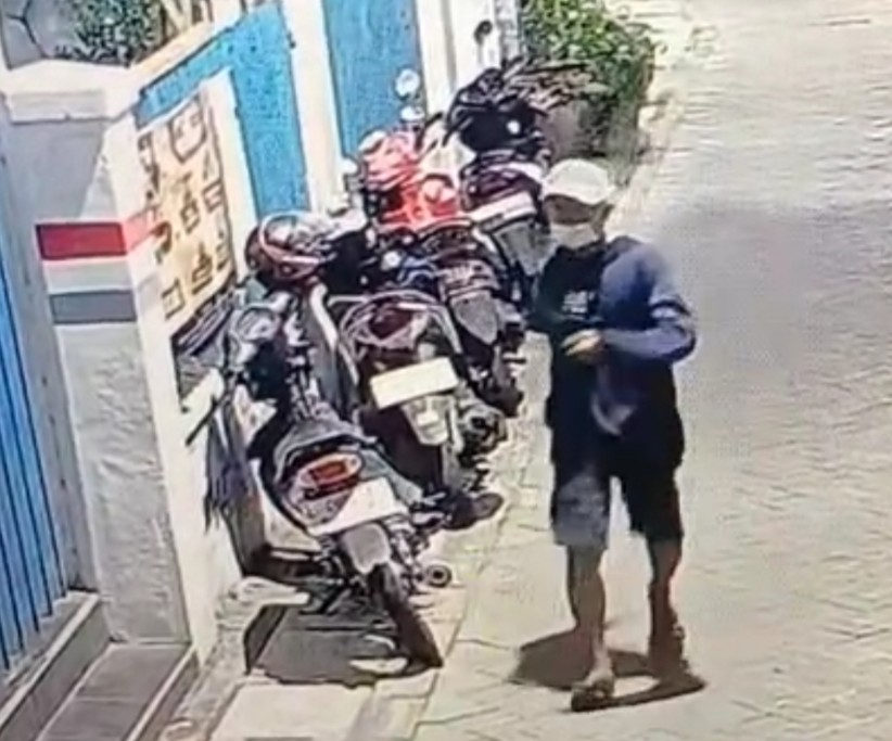Dalam rekaman CCTV tampak pelaku berjalan kaki memasuki gang dengan mengawasi situasi serta mencari motor yang tanpa diawasi oleh pemiliknya serta tak ada kunci pengaman tambahan.