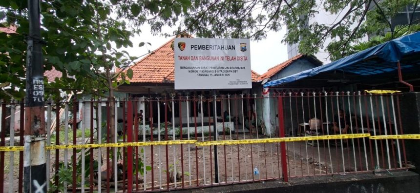 Dilokasi bangunan, selain terpasang garis polisi juga dipasangi papan pemberitahuan penyitaan tanah dan bangunan disita berdasarkan surat penetapan ijin sita khusus Nomor : 190/PENPID/.B.S-SITA/2026/PN SBY Tanggal 15 Januari 2026.