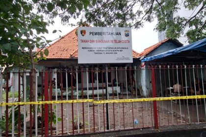 SURABAYA - Penyidik Satreskrim Polrestabes Surabaya menyegel dengan garis Polisi terhadap tanah dan bangunan yang digunakan kantor DPP Madas di…