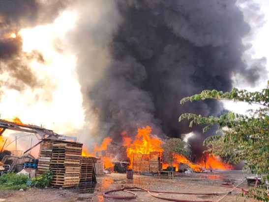Api beserta asap terlihat membumbung tinggi. Kebakaran gudang itu diduga disebabkan oleh bahan Valet kayu dan plastik yang terbakar.